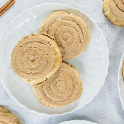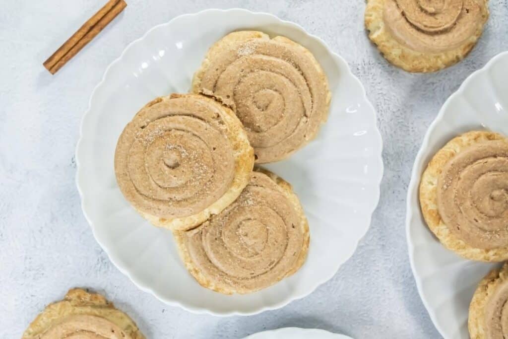 - Pipe a spiral of frosting on each cookie and sprinkle with the reserved cinnamon sugar.