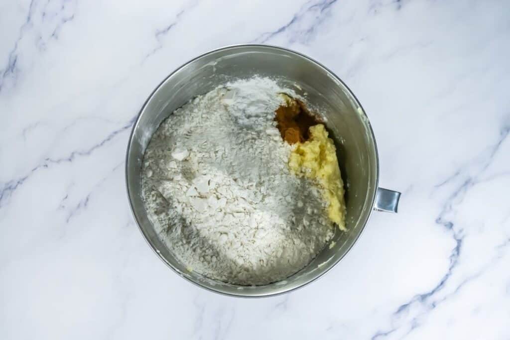 - Add the flour, cinnamon, and baking powder. Mix until combined, scraping the sides and bottom.